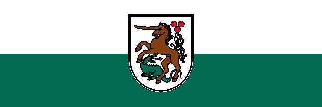 The flag is rectangular, in ratio 1:3, horizontally divided white-green with the coat of arms in the middle. The width of the coat of arms is 3/5 of the hoist size.